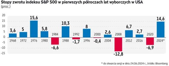 Nowojorski indeks S&P 500 zyskał od początku roku do poniedziałkowego otwarcia 14,6 proc. Jeśli więc w nadchodzących dniach nie dojdzie do bardzo ostrej jego przeceny, to pierwsze sześć miesięcy 2024 r. może dla niego być najlepszym pierwszym półroczem w amerykańskim roku wyborczym od 1976 r. Ówczesna, rekordowa, stopa zwrotu może być również w tym tygodniu przewyższona. Wszak w pierwszych sześciu miesiącach 1976 r. wyniosła ona 15,6 proc.
