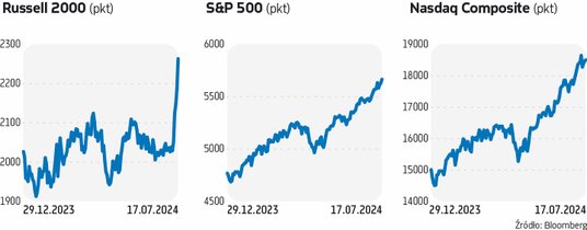 Od początku roku do rozpoczęcia środowej sesji Russell 2000 wzrósł o 12,5 proc., podczas gdy S&P 500 zyskał 18,8 proc., a Nasdaq Composite urósł o 23,3 proc. Akcje amerykańskich małych spółek zaczęły silniej zyskiwać dopiero w lipcu, a w poprzednich miesiącach radziły sobie raczej słabo. Russell 2000 od początku roku do końca czerwca wzrósł jedynie o nieco ponad 1 proc., podczas gdy S&P 500 urósł o 14,5 proc., a Nasdaq Composite o 18,1 proc. Hossa na Wall Street była więc napędzana głównie przez duże spółki, w tym przez giganty technologiczne takie jak Nvidia. Co sprawiło więc, że papiery małych firm zaczęły od zeszłego tygodnia solidnie zyskiwać? Analitycy wiążą ich zwyżki z danymi wskazującymi, że inflacja konsumencka w USA była w czerwcu niższa od prognoz oraz z rosnącymi szansami na to, że Fed obniży we wrześniu stopy.