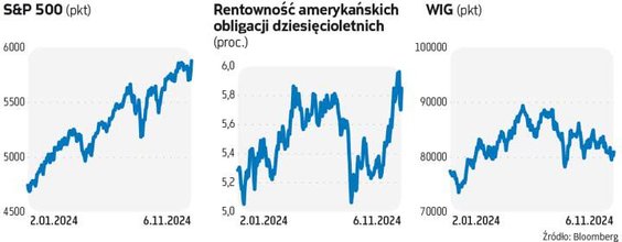 Kontrakty na amerykańskie indeksy akcji wyraźnie zyskiwały w rytm spływających wyników z amerykańskich wyborów, wskazujących na powrót Donalda Trumpa na prezydencki fotel, a otwarcie sesji potwierdziło optymizm inwestorów – S&P 500 i Nasdaq wzbiły się na nowe rekordy. W Europie sytuacja nie była już tak jednoznaczna. Główne indeksy początkowo również mocno zyskiwały, ale im bliżej było końca sesji, tym zapał do zakupów malał, również na GPW. Na rynkach obligacji doszło zaś do zwyżek rentowności. Oprocentowanie amerykańskich papierów dziesięcioletnich rosło aż o 18 pkt baz., do 4,45 proc., tj. poziomu najwyższego od czterech miesięcy. Krajowy rynek obligacji zniwelował zaś część spadków oprocentowania z dwóch pierwszych dni tygodnia, aczkolwiek warto pamiętać, że pod koniec października oprocentowanie polskich obligacji dziesięcioletnich chwilami sięgało ponad 6 proc. i było najwyższe od ponad roku. W którą stronę pójdą rynki akcji i obligacji w kolejnych tygodniach?