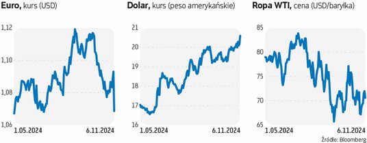 Pod presją było również euro, które zniżkowało o prawie 2 proc. Inwestorzy uznali bowiem, że UE też może być zagrożona wojną handlową z USA. „Zwycięstwo Trumpa oznacza cła, które negatywnie wpłyną na wzrost gospodarczy w Europie. Komisja Europejska zapewne odpowie na nie symetrycznie, co będzie oznaczało wyższą inflację w strefie euro lub (…) może zmusić spółki do absorbowania wyższych kosztów, co może skutkować tym, że niektóre spośród tych firm będą się zamykać, a bezrobocie wzrośnie” – ostrzegli analitycy Nomury.