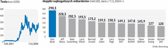 „Druga kadencja Trumpa będzie okresem największej zabawy, jakiej nie miała Ameryka od pewnego czasu. Będzie wspaniale!” – zatweetował Elon Musk 31 października. Sześć dni później świętował zwycięstwo wyborcze Trumpa. Prezydent elekt zaprosił go na scenę i mocno chwalił rozwiązania technologiczne wdrażane przez Starlink i SpaceX. – To wyjątkowy facet. To supergeniusz. Musimy chronić naszych geniuszy, bo nie mamy ich zbyt wielu – mówił Trump. Nic dziwnego więc, że akcje Tesli skoczyły podczas środowej sesji o prawie 15 proc. Majątek Muska powiększył się w ciągu jednego dnia o 26,5 mld USD i sięgnął 290,3 mld USD. Musk umocnił pozycję najbogatszego człowieka w zestawieniu miliarderów Bloomberga. 119 mln USD poświęcone wcześniej na komitet wspierający kampanię Trumpa (czy nawet pół miliarda dolarów wsparcia od Muska, o których ponoć mówił swoim współpracownikom Trump) okazało się więc znakomitą inwestycją. Zapewne nie skończy się tylko na jednorazowym skoku majątku ekscentrycznego miliardera. Nie jest bowiem żadną tajemnicą, że Musk widzi dla siebie rolę w nowej administracji. Miałby więc brać udział w kształtowaniu polityki gospodarczej i w zmienianiu USA według swoich marzeń.