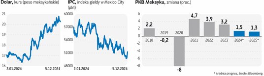 Powrót do władzy Trumpa musiał negatywnie wpłynąć na postrzeganie Meksyku przez inwestorów. Wszak republikański prezydent elekt jest mocno kojarzony z wojnami handlowymi i postulatem zbudowania muru na południowej granicy USA, mającego zatrzymać napływ nielegalnych imigrantów i narkotyków. Peso meksykańskie straciło więc od początku roku blisko 17 proc. wobec dolara. Przez ostatni miesiąc straciło tylko ponad 1 proc., ale jego notowania doszły w zeszłym tygodniu do 20,8 peso za 1 USD, czyli do poziomu niewidzianego od wiosny 2022 r. IPC, główny indeks giełdy meksykańskiej, spadł od początku roku o 12 proc. Częściowo da się to wyjaśnić tym, że rynek spodziewał się zwycięstwa Trumpa, ale dużą rolę odegrały również negatywne reakcje inwestorów na to, że czerwcowe wybory prezydenckie w Meksyku wygrała z dużą przewagą Sheinbaum, a silną większość w parlamencie zdobył jej lewicowy blok Sigamos Haciendo Historia. Do tej wyprzedaży przyczyniła się także kontrowersyjna reforma systemu sprawiedliwości wdrożona przez administrację dotychczasowego, lewicowego prezydenta Andresa Manuela Lopeza Obradora.