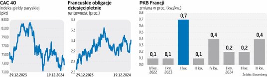 W ostatnich tygodniach rentowność francuskich obligacji dziesięcioletnich zbliżyła się do rentowności podobnych greckich papierów, a niekiedy lekko ją nawet przewyższała. Bynajmniej nie świadczy to o tym, że Francja jest postrzegana przez rynki jako potencjalny bankrut. W tym tygodniu rentowność jej dziesięciolatek była nieco powyżej 3 proc., co jest stosunkowo bezpiecznym poziomem. Francuskie papiery miały jednak w ostatnich tygodniach rentowność wyższą od podobnych obligacji wszystkich dawnych „słabych ogniw strefy euro” poza Włochami. Dochodowość francuskich obligacji dziesięcioletnich wzrosła przez ostatnie 12 miesięcy z poziomu około 2,5 proc., a szczyt na poziomie 3,37 proc. osiągnęła na przełomie czerwca i lipca, czyli między dwiema turami ostatnich wyborów parlamentarnych.