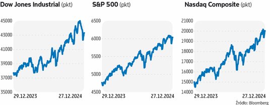 Rok 2024 był dla Wall Street niezwykle udany. S&P 500, Dow Jones Industrial i Nasdaq Composite ustanawiały rekord za rekordem, rosnąc szybciej, niż spodziewała się znaczna większość strategów z Wall Street. Dow Jones Industrial przebił w grudniu poziom 45 tys. pkt (choć później zaliczył dłuższą serię spadków), S&P 500 zbliżył się do 6100 pkt, a Nasdaq Composite przekroczył 20 tys. pkt. Inwestorzy mieli wiele powodów do radości. Gospodarka USA nie tylko uniknęła recesji, ale okazała się zaskakująco silna. Zyski spółek rosły, a wraz ze zwycięstwem w wyborach Donalda Trumpa pojawiła się nadzieja na bardziej probiznesową politykę rządu USA. Pod koniec roku inwestorów zaczęła jednak martwić kwestia stóp procentowych. Giełdy zareagowały bardzo nerwowo po posiedzeniu Fedu z 18 grudnia, na którym przedstawiono projekcję, zgodnie z którą w 2025 r. może dojść tylko do dwóch obniżek stóp. Coraz częściej zaczęły się też pojawiać opinie, że ceny amerykańskich akcji w poprzednich miesiącach poszły w górę zbyt szybko. Inwestorzy zastanawiają się więc, czy rok 2025 ma szansę przynieść kolejne zwyżki indeksów. Może nie tak spektakularne jak w poprzednich miesiącach, ale oznaczające podtrzymanie hossy.