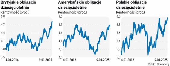 Rentowność brytyjskich obligacji dziesięcioletnich sięgała w czwartek nawet 4,96 proc., czyli najwyższego poziomu od 2008 r. W przypadku papierów trzydziestoletnich dochodziła ona do 5,44 proc. i była najwyższa od 1998 r. Tymczasem funt stał się najsłabszy od 14 miesięcy wobec dolara. W czwartek rano za 1 funta płacono tylko 1,225 USD. Niewiele więc pomogła środowa werbalna interwencja brytyjskiego resortu finansów, w ramach której Rachel Reeves, kanclerz skarbu, zapewniała, że będzie trzymała finanse publiczne w "żelaznym uścisku". Sytuacja na rynku obligacji była w czwartek tematem debaty w parlamencie brytyjskim. Opozycja wzywała kanclerz Reeves do rezygnacji z podróży do Chin i zajęcia się powstrzymywaniem wstrząsów na rynkach. Pojawiły się porównania z kryzysem rynkowym z jesieni 2022 r. (wówczas konserwatywny rząd Liz Truss sprowokował wyprzedaż funta i obligacji swoimi planami cięcia podatków), a nawet z brytyjskim kryzysem zadłużeniowym z 1976 r.
