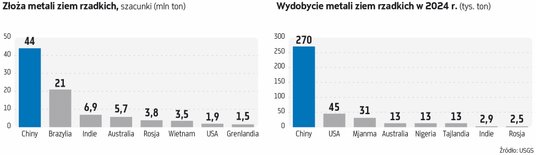Według szacunków Sondażu Geologicznego USA (USGS) w 2024 r. wydobyto na całym świecie 390 tys. ton metali ziem rzadkich. Z tego aż 270 tys. ton zostało wydobyte w Chinach. Na drugim miejscu znalazły się Stany Zjednoczone z produkcją wynoszącą 45 tys. ton. Na trzeciej pozycji uplasowały się Mjanma z wydobyciem wynoszącym 31 tys. ton. Kolejne miejsca zajęły: Australia (13 tys. ton), Nigeria (13 tys. ton), Tajlandia (również 13 tys. ton), Indie (2,9 tys. ton), Rosja (2,5 tys. ton) oraz Madagaskar (2 tys. ton).