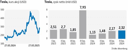 W dołku z 11 marca, za akcje Tesli płacono po 212 USD, czyli najmniej od października i o 55 proc. mniej niż w szczycie. Później zdołały odrobić część strat. W poniedziałek, 24 marca, zyskały nawet aż 12 proc. podczas sesji. Zapewne część inwestorów uznała, że akcje Tesli stały się już wystarczająco tanie. Wokół spółki nadal utrzymują się jednak emocje polityczne. Tim Walz, gubernator Minnesoty i zarazem zeszłoroczny demokratyczny kandydat na wiceprezydenta, publicznie wyrażał radość z powodu spadku cen akcji Tesli. (Zrobił to, choć jego stanowy fundusz emerytalny mocno wcześniej inwestował w te papiery). Do kupowania samochodów Tesli namawiał natomiast Howard Lutnick, amerykański sekretarz skarbu. W promowanie tej marki samochodów zaangażował się też prezydent Trump, a rząd Izraela demonstracyjnie zamówił ich partię do celów reprezentacyjnych, by pokazać, że nie uważa Muska za „nazistę”.