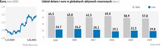 Nie zapominajmy, że euro zostało zaprojektowane jako waluta wpisana w „mocarstwowe” plany brukselskich urzędników, że gospodarka UE w przyszłości zdoła prześcignąć amerykańską. W pierwszej dekadzie XXI w. pojawiało się wiele prognoz, że „wkrótce” wspólna unijna waluta zdetronizuje dolara i stanie się główną walutą rezerwową świata. Te prognozy się jednak nie sprawdziły. Z danych Międzynarodowego Funduszu Walutowego wynika, że udział euro w globalnych aktywach rezerwowych osiągnął swój szczyt w 2009 r. Wówczas sięgał 27,66 proc. W 2024 r. wynosił natomiast 19,83 proc. Udział dolara spadł natomiast w latach 2009–2024 z 62,05 proc. do 57,8 proc. W XXI w. osiągnął on szczyt w 2001 r. na poziomie 71,51 proc. Przez ostatnie ćwierćwiecze więc znacząco spadł, ale bywało, że wcześniej był on dużo niższy. Na przykład w 1990 r. wynosił on 47,14 proc. Też niektórzy wówczas wieszczyli „rychły” upadek dolara, ale ich projekcje się nie sprawdziły. Obecnie raczej nie zapowiada się na to, by euro stosunkowo szybko mogło osiągnąć podobnie duży udział w globalnych rezerwach jak obecnie dolar.
