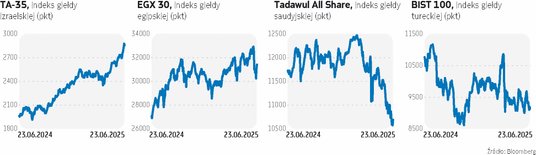 Reakcja rynków na amerykańskie uderzenie w obiekty związane z irańskim programem nuklearnym była dosyć powściągliwa. Na większości giełd azjatyckich doszło w poniedziałek jedynie do lekkiej przeceny. Japoński indeks Nikkei 225 stracił tylko 0,1 proc., a południowokoreański KOSPI spadł o 0,2 proc. Mocniej traciły tajwański Taiex (-1,4 proc.) i filipiński PSEi (-1,9 proc.), ale Hang Seng, główny indeks giełdy w Hongkongu, zyskał 0,7 proc. Większość europejskich indeksów giełdowych lekko traciła po południu. WIG20 zniżkował wówczas o 1,7 proc. Sesja w Nowym Jorku zaczęła się natomiast od lekkich spadków. Dow Jones Industrial otworzył się niemal płasko.