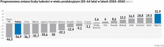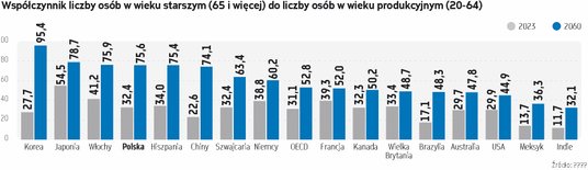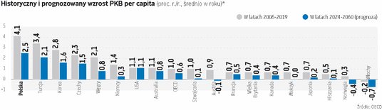 Dla krajów OECD wskaźnik obciążenia demograficznego liczony jako udział osób w wieku 65 lat i więcej względem populacji osób w wieku produkcyjnym (20–64 lata) urośnie między 2023 a 2060 r. z 32 do 53 proc. Co kluczowe, Polska będzie jednym z krajów najmocniej uderzonych zmianą demograficzną – u nas ten wskaźnik urośnie według prognoz OECD z około 32 do 76 proc. Z szacunków organizacji wynika, że pomiędzy 2024 a 2060 r. ubędzie w Polsce około 37 proc. osób w wieku produkcyjnym – ich liczba spadnie z około 23 mln do 14,5 mln. To zaś uderzy w nasz potencjał rozwojowy, obniżając nasze średnie rocznie tempo wzrostu PKB na osobę z około 4 proc. w latach 2006–2019 do 2,5 proc. w latach 2024–2060. – Tylko Polska, Słowacja i Chile zaliczą tak silne wyhamowanie – wskazuje Andrzej Kubisiak, zastępca dyrektora w Polskim Instytucie Ekonomicznym.