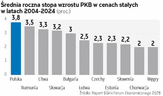 W otwierającym raport rozdziale o perspektywach rozwoju krajów Europy Środkowo-Wschodniej w latach 2025–2035, eksperci SGH wykazali, że wzrost gospodarczy w 11 krajach naszego regionu w okresie od 2004 r. do 2024 r. był przeciętnie blisko trzykrotnie szybszy niż w krajach „starej” Unii. Okazał się przy tym najbardziej odporny spośród wszystkich modeli kapitalizmu w UE na szoki w postaci pandemii covid-19 i wojny w Ukrainie. Najszybszy wzrost gospodarczy spośród 11 krajów naszego regionu Europy osiągnęła w badanym okresie Polska. Średnia roczna stopa wzrostu PKB w cenach stałych sięgnęła u nas 3,8 proc.
