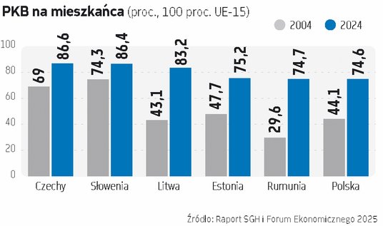 Po 21 latach członkostwa w UE kraje Europy Środkowo-Wschodniej nadrobiły ponad 31 pkt proc. w stosunku do średniego poziomu PKB per capita krajów „rdzenia” Unii (UE-15). Najszybciej proces ten przebiegał w latach 2004–2024 w Rumunii (45 pkt proc.) i Litwie (40 pkt proc.), a następnie w Bułgarii (33 pkt proc.) i Polsce (30,5 pkt proc.), najwolniej zaś (poniżej 20 pkt proc.) w Słowenii, Czechach i Węgrzech.