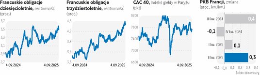 Paryski indeks giełdowy CAC 40 jest wyraźnie osłabiony, a rentowność francuskich obligacji dziesi...