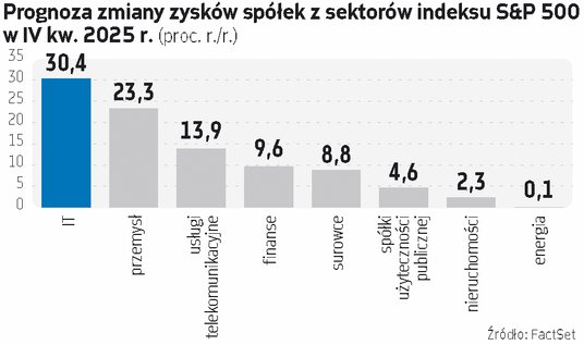Z danych zebranych przez FactSet wynika, że podczas tego sezonu wyników najlepiej radzą sobie spółki z sektora IT. Ich zysk na akcję prawdopodobnie był o nieco ponad 30 proc. większy niż rok wcześniej. (Na koniec 2025 r. prognozowano 25,8 proc. zwyżki tego wyniku.) 95 proc. spółek z tego sektora miało zysk na akcję wyższy, niż oczekiwano. Spółki z sektora usług komunikacyjnych (do którego zaliczany jest m.in. koncern Meta Platforms) prawdopodobnie powiększyły swój zysk na akcję w I kwartale o 13,9 proc., a jak dotąd wszystkie z nich miały wyniki lepsze od prognoz. Na koniec grudnia spodziewano się, że zysk na akcję wzrośnie o 6,2 proc.