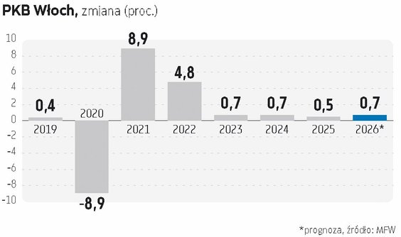 FTSE MIB, główny indeks giełdy w Mediolanie, zyskał od początku tego roku stosunkowo niewiele – ponad 1 proc. Przez ostatnie 12 miesięcy wzrósł jednak o blisko 19 proc., a od objęcia władzy przez rząd Meloni o ponad 120 proc. Niedawno sięgnął on najwyższego poziomu od listopada 2000 r. Do rekordu brakuje mu około 8 proc. Rentowność włoskich obligacji dziesięcioletnich spadła natomiast w lutym poniżej poziomu 3,4 proc. i była najniższa od październikowego dołka, a zarazem podobna jak w połowie 2022 r. Była ona porównywalna z rentownością podobnych francuskich papierów. Włochy, wraz z innymi państwami południa Europy, już dawno przestały być postrzegane jako słabe ogniwa strefy euro. Pod pewnymi względami ich gospodarka radziła sobie w ostatnich latach lepiej niż niemiecka. W 2022 r. PKB Włoch wzrósł o 4,8 proc., a Niemiec o 1,8 proc. W 2023 r. gospodarka włoska powiększyła się o 0,7 proc., a niemiecka skurczyła się o 0,9 proc. W 2024 r. Włochy miały również 0,7 proc. wzrostu, a Niemcy 0,5 proc. spadku, a w 2025 r. odpowiednio 0,5 proc. i 0,2 proc. zwyżki PKB. Międzynarodowy Fundusz Walutowy spodziewa się, że w tym roku Niemcom uda się jednak lekko wyprzedzić Włochy pod względem tempa wzrostu gospodarczego. Gospodarka RFN ma urosnąć o 1,1 proc., a Italii o 0,7 proc. Mediana prognoz analityków zebranych przez Bloomberga sugeruje natomiast tegoroczny wzrost włoskiego PKB o 0,8 proc. Najwięksi pesymiści prognozują 0,3 proc. wzrostu (Morgan Stanley), a najwięksi optymiści 1,1 proc. (SMBC Nikko i Moody’s).
