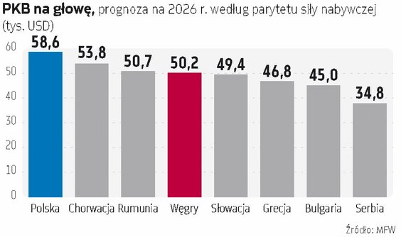Czy 16 lat (dotychczasowych) rządów Orbana można ogólnie uznać za udane czy też za stracone dla gospodarki węgierskiej? Do 2020 r. były one przyzwoite pod względem wzrostu PKB oraz innych kluczowych wskaźników, ale później gospodarka doznała wyraźnej zadyszki. W 2010 r. węgierski PKB na głowę (liczony według parytetu siły nabywczej) wynosił 21,87 tys. USD , podczas gdy polski 21,35 tys. USD , a rumuński 18,26 tys. USD . W 2025 r. sięgał on natomiast na Węgrzech 48,16 tys. USD , w Rumunii 48,85 tys. USD , a w Polsce 55,34 tys. USD trudno więc uznać orbanowskie Węgry za gospodarczy wzór dla regionu. Tymczasem BUX, główny indeks giełdy w Budapeszcie, zyskał od 29 maja 2010 r. (czyli od objęcia władzy przez Fidesz) około 465 proc., z czego 150 pkt proc. przypadało na 13 lat rządów. Giełda węgierska poszła więc mocno w górę akurat w okresie, gdy sytuacja gospodarcza się pogorszyła, a wzrosły szanse na zmianę władzy.