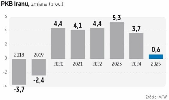 o tyle wzrósł PKB Iranu w 2025 r., po tym jak w 2024 r. powiększył się o 3,7 proc. Jeszcze przed wojną ten kraj przechodził więc poważne spowolnienie gospodarcze.