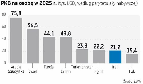tyle wynosił w 2025 r. PKB Iranu na głowę (liczony według parytetu siły nabywczej). Iran był więc krajem mniej zamożnym niż Turkemnistan, Egipt czy Armenia, a zamożniejszym od Iraku