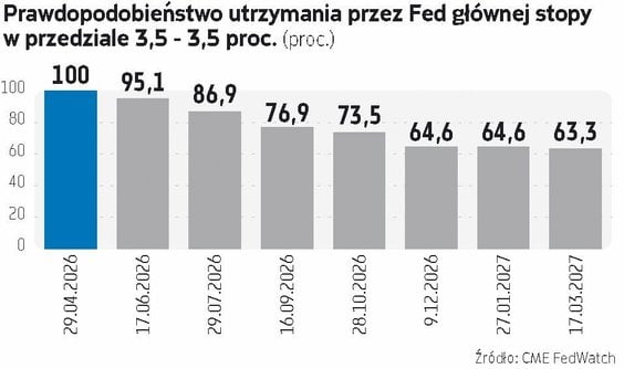 Inwestorzy są więc pewni, że w środę wieczorem Fed utrzyma swoją główną stopę procentową w dotychczasowym przedziale 3,50-3,75 proc. Barometr CME FedWatch pokazywał w poniedziałek, że prawdopodobieństwo podjęcia przez Fed takiej decyzji wynosi 100 proc. (Inwestorzy nie będą też raczej przywiązywali dużej wagi do słów, które wygłosi Powell na swojej najprawdopodobniej ostatniej konferencji w roli szefa Fedu.) Rynek nie spodziewa się też, by do obniżek stóp procentowych w USA miało dojść w nadchodzących miesiącach. CME FedWatch pokazywał w poniedziałek, że jest mniej niż 5 proc. szans na cięcie stóp 17 czerwca, czyli na pierwszym posiedzeniu, któremu będzie przewodniczył Warsh. Prawdopodobieństwo tego, że po październikowym posiedzeniu, główna stopa procentowa Fedu będzie wynosiła tyle, co obecnie, sięga 73,5 proc. To, że zostanie ona na takim samym poziomie w grudniu, było wyceniane w poniedziałek na 64,6 proc. Według CME FedWatch, szanse na cięcie stóp stają się wyższe niż 50 proc. dopiero od września 2027 r.