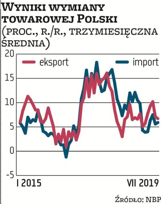 Jak wynika z piątkowych danych NBP, rzeczywistość okazała się nawet lepsza. Patrząc w szerszej perspektywie, polscy eksporterzy odczuwają jednak skutki dekoniunktury w strefie euro, szczególnie recesji w przemyśle Niemiec. W pierwszych siedmiu miesiącach br. sprzedaż polskich towarów za granicę rosła średnio w tempie 7,6 proc. rocznie, a więc nawet szybciej niż w 2018 r. (6,7 proc.), gdy spowolnienie w strefie euro się rozpoczęło. W 2017 r. polski eksport rósł jednak średnio w tempie 13,8 proc. rok do roku.
