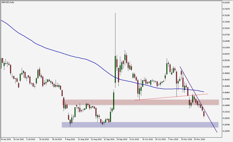 Kolejny tydzień za nami, który przebiegał pod dyktando sprzedających na rynku kryptowalut. Cena bitcoina spadła do kolejnego poziomu wsparcia w rejonie 3300 USD. Tutaj znajdują się dwa ważne poziomy: lokalne dołki z połowy grudnia oraz zniesienie zewnętrzne 200 proc. fali wzrostowej z przełomu czerwca i lipca. Na wykresie widzimy, że notowania już wcześniej reagowały na zniesienie 150 proc. wspomnianej fali, jednak w tamtym wypadku walkę wygrały niedźwiedzie. Kierunek długoterminowy pozostaje bez zmian, co potwierdza układ średnich 50, 100 i 200-okresowych. W krótkim terminie widoczny jest jednak potencjał do większego odreagowania, nawet w okolice 4500 USD. Jeśli wsparcie na poziomie 3300 USD zostanie jednak przełamane, to kolejny bastion kupujących znajduje się dopiero w okolicach psychologicznych 2000 USD.