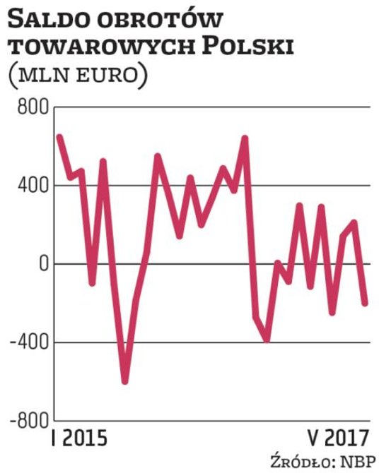Z powodu spodziewanego odbicia inwestycji po ich ubiegłorocznym tąpnięciu ekonomiści powszechnie oczekują, że w najbliższych kwartałach import będzie nadal rósł szybciej niż eksport. I to pomimo tego, że temu ostatniemu sprzyja dobra koniunktura w strefie euro, w tym w Niemczech, które są najważniejszym zagranicznym rynkiem zbytu polskich firm. W efekcie wyniki handlu zagranicznego będą prawdopodobnie negatywnie wpływały na tempo wzrostu polskiej gospodarki. Według prognoz departamentu analiz ekonomicznych NBP w tym roku tzw. eksport netto odejmie od wzrostu PKB 0,6 pkt proc., a w 2018 r. 0,5 pkt proc. Dla porównania, w latach 2015–2016 dodawał do wzrostu przeciętnie 0,5 pkt proc.