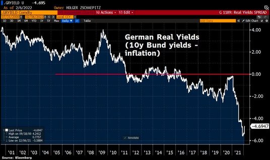 W USA ruch był początkowo bardziej stłumiony, ale po zaskakująco mocnym raporcie o zatrudnieniu w styczniu w piątek, rentowności 10-letnich obligacji skarbowych wzrosły do ??najwyższego poziomu od stycznia 2020 r., a inwestorzy zaczęli wyceniać z większym prawdopodobieństwem sześć podwyżek stóp procentowych do końca roku. Inwestorzy wreszcie po raz pierwszy od czerwca zaczęli uzyskiwać dodatnią realną stopę zwrotu z 30-letnich obligacji amerykańskich. W czwartek rentowności obligacji Wielkiej Brytanii i Niemiec skoczyły o ponad 10 punktów bazowych po tym, jak Bank Anglii i Europejski Bank Centralny odbyły spotkania polityczne i zasygnalizowały patentowy niepokój związany z podwyższoną presją inflacyjną. Rentowność 10-letnich obligacji Niemiec, która do tego tygodnia była poniżej zera, podskoczyła do około 0,15 proc., osłabiając to, co było kotwicą dla rentowności obligacji skarbowych, gdy europejscy inwestorzy przesunęli pieniądze do USA, aby uzyskać dodatnie zwroty. Utrzymujący się wzrost powyżej zera dla niemieckiego bunda może torować drogę do testu rentowności 10-letnich obligacji na poziomie 2 proc. i wyższym. Tyle że przy obecnym poziomie inflacji realna rentowność nadal będzie ujemna - do tej pory przez 69 kolejnych miesięcy.