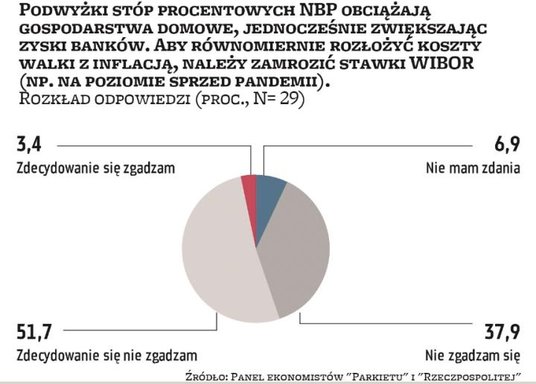 Uczestnikom panelu ekonomistów „Parkietu" i „Rz" przedstawiliśmy do oceny m.in. taką tezę: „Podwyżki stóp procentowych NBP obciążają gospodarstwa domowe, jednocześnie zwiększając zyski banków. Aby równomiernie rozłożyć koszty walki z inflacją, należy zamrozić stawki WIBOR (np. na poziomie sprzed pandemii)". Zgodził się z nią zaledwie jeden z 29 ekonomistów, którzy wzięli udział w 11. rundzie naszego panelu. Nie zgodziło się z nią 26 ankietowanych (90 proc.), w tym 15 wyraziło zdecydowany sprzeciw.