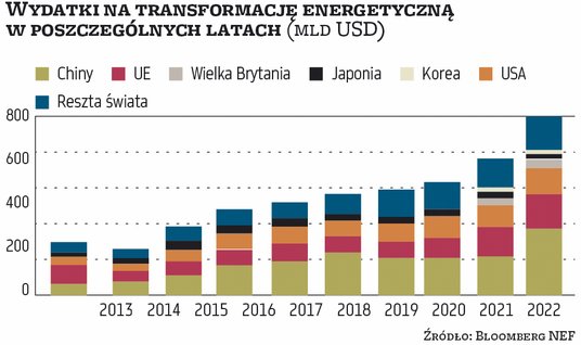 W USA przyjęto największy w historii pakiet inwestycji w transformację energetyczną. Okazuje się jednak, że nawet po jego uwzględnieniu globalnym liderem pod względem ich wartości pozostaną Chiny (ramka 6). Warte uwagi jest poświęcenie, jakie w obliczu kryzysu energetycznego wykazuje Hiszpania. Choć jej gospodarka nie jest najbardziej narażona w razie zamknięcia w sezonie grzewczym przez Rosję kurka z gazem, to w kraju wprowadzane są daleko idące oszczędności w zużyciu energii (ramka 5).