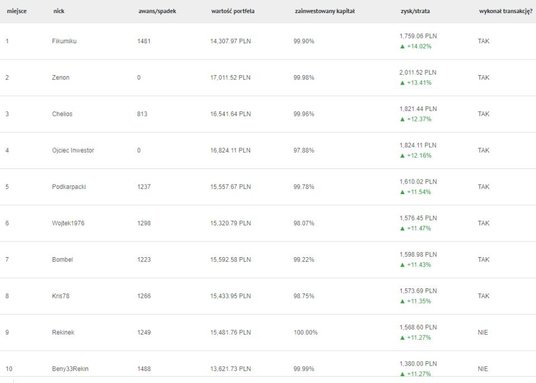 Właśnie wybił półmetek pierwszego etapu Parkiet Challenge. Po raz w tej edycji gry rozdajemy nagrody tygodniowe. Tym razem było nieco trudniej niż w pierwszym tygodniu. By dostać się do pierwszej trójki, potrzeba było około 12,4-proc. stopy zwrotu. Najwyższą stopę zwrotu w trakcie pięciu poprzednich sesji wypracował użytkownik o nicku "Fikumiku". W tydzień osiągnął 14,02 proc. zysku. Numerem dwa, z 13,4-proc. stopą zwrotu, jest "Zenon", natomiast na ostatnie miejsce podium wskoczył "Chelios", który wypracował 12,37 proc. zysku w tydzień.