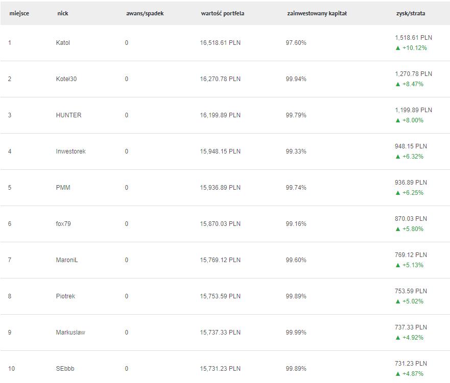 W grze bierze udział około 1,5 tys. osób. Przypomnijmy, że gracze handlują akcjami spółek z WIG20 oraz mWIG40. Jak dotąd wykonano około 11,5 tys. transakcji o wartości przeszło 22 mln zł.