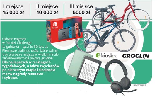 Dwa e-rowery Groclin Model M City Boss w wersji damskiej oraz męskiej trafią do osób, które po pierwszym etapie gry osiągną najwyższą stopę zwrotu w odrębnych klasyfikacjach odpowiednio kobiet oraz mężczyzn. Taka nagroda to nowość w Parkiet Challenge.