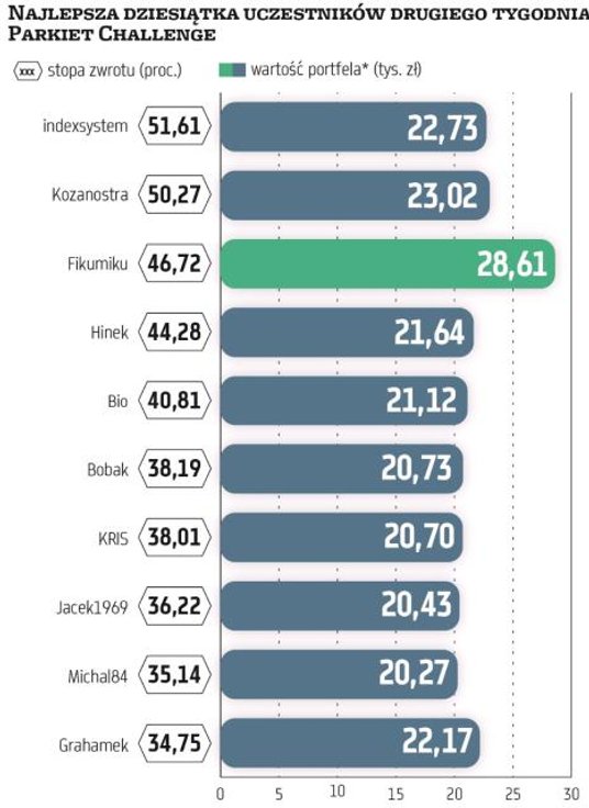 W całej grze numerem jeden pozostaje użytkownik o nicku „Fikumiku" z wynikiem blisko 91 proc. Jego przewaga nad drugim miejscem to prawie 30 pkt proc. W pierwszej dziesiątce pod koniec poprzedniego tygodnia znalazł się „indexsystem". I to właśnie on zdołał wypracować najwyższą stopę zwrotu w drugim tygodniu rywalizacji.