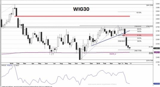Od początku maja indeks gromadzący 30 największych spółek z warszawskiego parkietu stracił już 6,3 proc. W poniedziałek jego notowania dotarły w porywach do 2381 pkt. To nowe tegoroczne minimum i najniższy poziom od listopada 2018 r. – Słabość strony popytowej nie pozwala na wyprowadzenie wzrostowej kontry, jednakże lokalne wyprzedanie oraz bliska obecność tygodniowej dwusetki rozbudzają nadzieję na pojawienie się korekty – mówi Piotr Neidek. Średnie kroczące często stanowią silne ruchome wsparcia, a im dłuższy okres średniej, tym silniejszego zaangażowania byków można się spodziewać. W tym przypadku mówimy o średniej z 200 tygodni, a więc obejmującej blisko cztery lata.