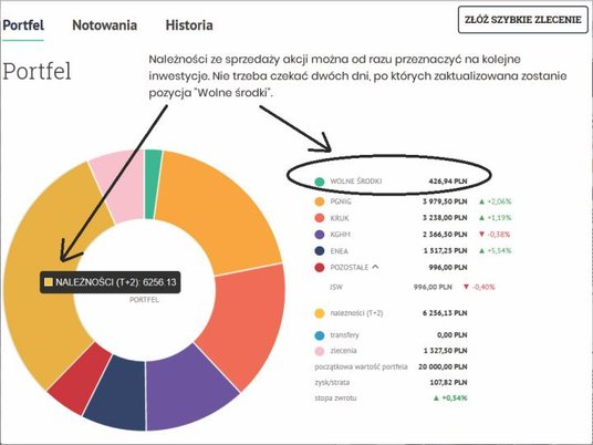 Jeden z uczestników zwracał uwagę, że nawet dzień po transakcji stan wolnych środków nie uległ zmianie. Zaznaczmy od razu, że nie jest to żaden błąd techniczny. Otóż po sprzedaży akcji na konkursowej platformie pieniądze nie od razu zasilą pozycję „Wolne środki", tylko po upływie dwóch dni. Platforma odzwierciedla bowiem realne inwestowanie, a na rzeczywistych rachunkach księgowanie tych kwot również jest odroczone w czasie. Nie oznacza to jednak, że nie można tych środków od razu wykorzystać do ponownych zakupów. Środki są w całości dostępne do reinwestycji od razu po transakcji. Ich wielkość widnieje w pozycji „Należności (T+2)", którą zaznaczyliśmy na powyższym obrazku. Reasumując – to, że wolne środki nie rosną po sprzedaży akcji, nie ma żadnego praktycznego znaczenia. Pieniądze ze sprzedaży walorów uczestnicy mogą od razu przeznaczyć na kolejne inwestycje.