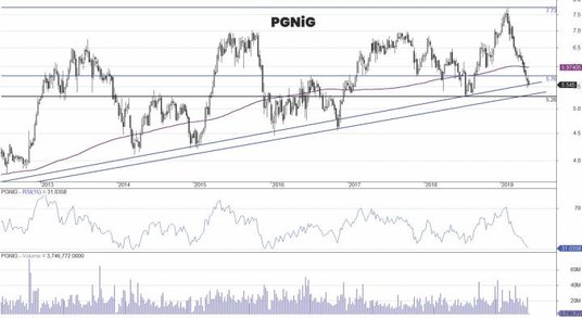 Na wykres PGNiG można spojrzeć długoterminowo, gdzie kluczowa jest linia trendu wzrostowego stanowiąca bazę dla impulsów hossy. Obecnie trwa fala spadkowa po cyklicznym osiągnięciu szczytu, ale jest wysoka szansa wyhamowania deprecjacji przy 5,2–5,5 zł. W ubiegłym tygodniu pojawiła się świeczka z długim dolnym cieniem, świadcząca o słabości podaży. Wprawdzie tygodniowy RSI nie jest jeszcze wyprzedany jak w drugiej połowie 2008 r., ale jest najniżej od ponad dziesięciu lat, stwarzając tym samym szansę na zmianę trendu.