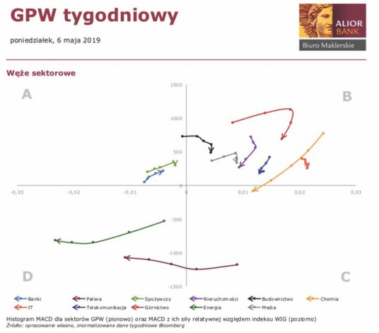 Na grafice mamy „macierz A-B-C-D". Zdaniem autorów koncepcji ta macierz pozwala na szybkie monitorowanie aktualnej technicznej atrakcyjności poszczególnych branż GPW dla kursów tygodniowych. Przedstawione na grafice „węże" obrazują, jak zmieniała się atrakcyjność danego sektora w ciągu ostatnich pięciu tygodni. Kierunek strzałki węża wskazuje stronę, w którą się on przemieszcza z tygodnia na tydzień. Ogon węża reprezentuje jego położenie sprzed pięciu tygodni. Węże konstruowane są w ten sposób, że pionowo liczony jest histogram MACD dla danego indeksu sektorowego, a poziomo liczony jest MACD z siły relatywnej tego indeksu sektorowego względem indeksu WIG.