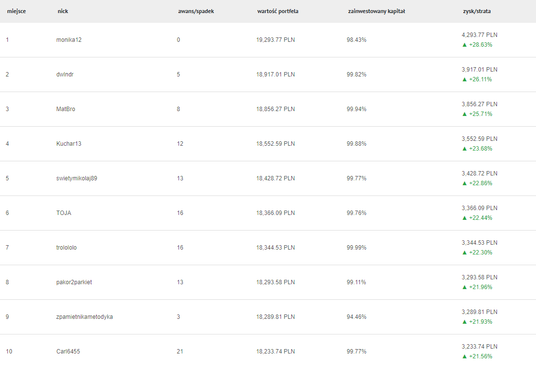 Po czterech tygodniach zakończył się pierwszy etap tegorocznej edycji gry Parkiet Challenge. Dziesiątka zawodników, która uzyskała najlepsze wyniki w tym czasie, przechodzi do finału. Wówczas uczestnicy gry powalczą przede wszystkim o nagrody pieniężne - zwycięzca otrzyma 15 tys. zł, za drugie miejsce przewidziane jest 10 tys. zł, zaś za trzecie 5 tys. zł. Oprócz tego przewidziane są także nagrody rzeczowe. Zwycięzca Parkiet Challenge zostanie wyłoniony w środę podczas finału w siedzibie Giełdy Papierów Wartościowych w Warszawie. Zaznaczmy, że zawodnicy przechodzą do finału z dorobkiem z pierwszego etapu. Obecnie na czele rankingu jest „monika12”, która wypracowała łącznie 28,6-proc. stopę zwrotu w trakcie czterech tygodni. Numerem dwa jest racz o nicku „dwlndr” z wynikiem 26 proc., a trzeci jest „MatBro” - jego zagrywki przyniosły 25,7 proc. zysku w pierwszym etapie. Warto zauważyć, że wspomniana „monika12” finiszowała na pierwszym miejscu także w rankingu po trzech tygodniach.