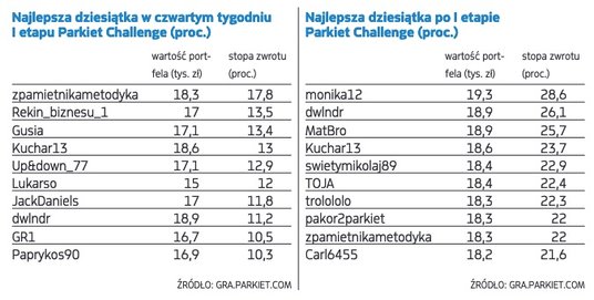 Z końcem zeszłego tygodnia rozstrzygnął się I etap Parkiet Challenge. Przypomnijmy, że uczestnicy mieli do dyspozycji spółki z WIG20, mWIG40, a także notowane na GPW ETF-y. Te ostatnie dawały możliwość zarabiania także podczas spadków, ale ogółem rynek pozostawał w trendzie wzrostowym, rozpoczętym jeszcze w październiku.
