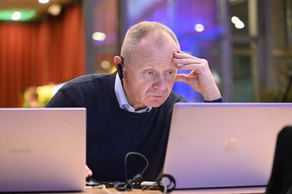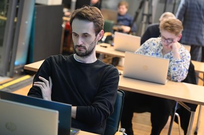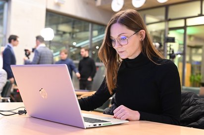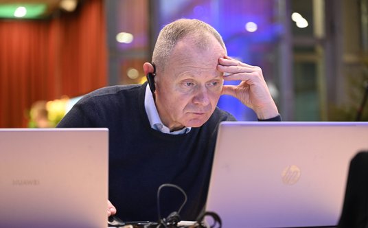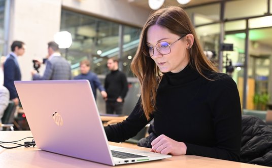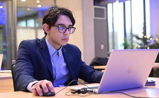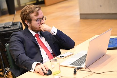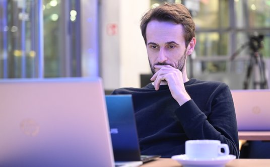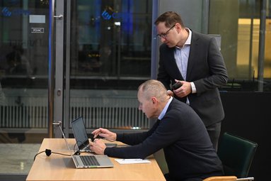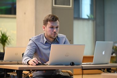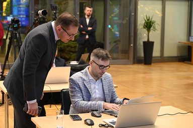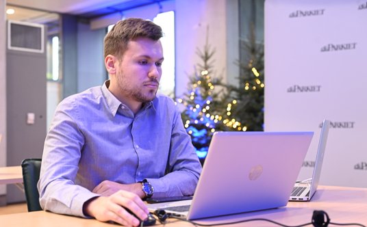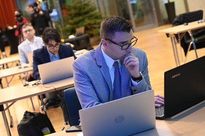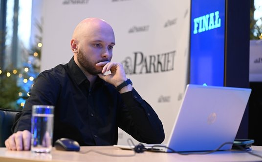 Dziennikarz Gazety Giełdy i Inwestorów "Parkiet" Przemysław Tychmanowicz relacjonuje finał Parkiet Challenge 2023