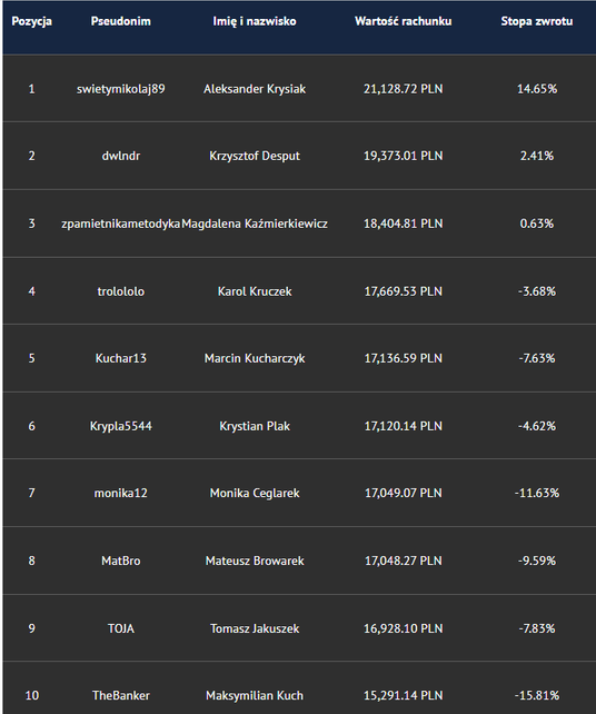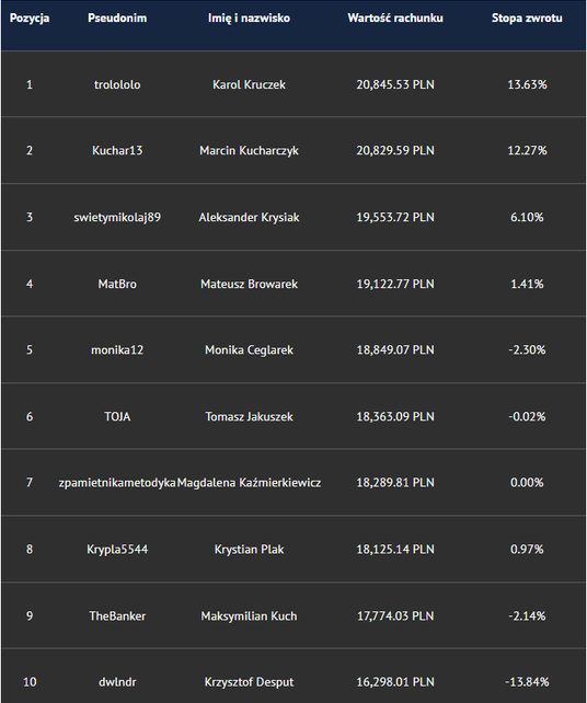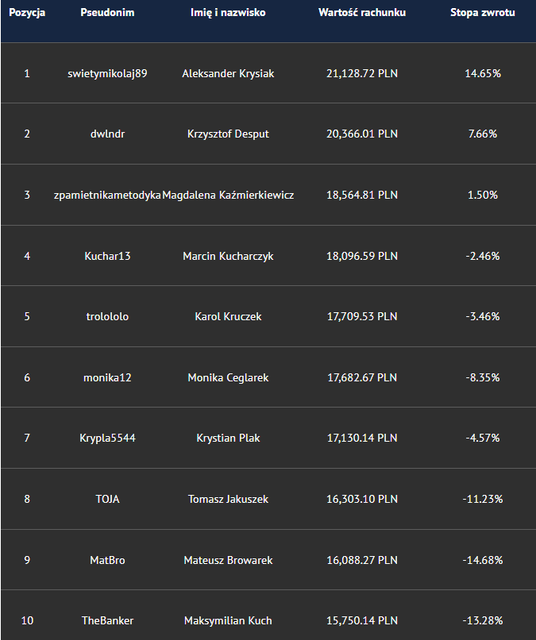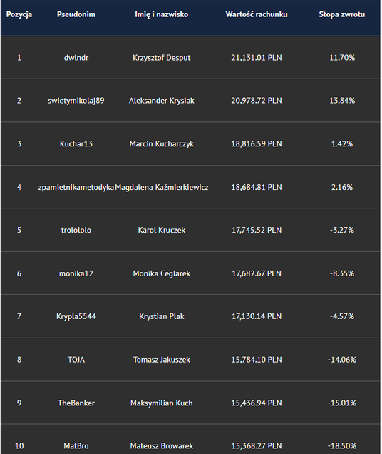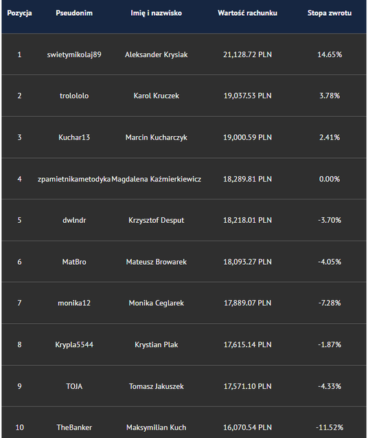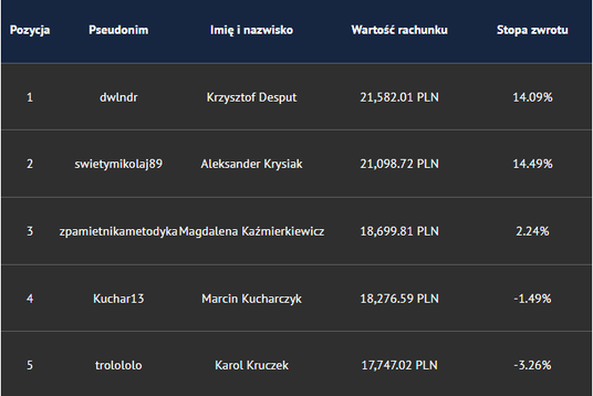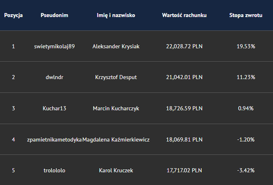 Na pierwsze miejsce wskakuje Aleksander Krysiak z prawie 15-proc. stopą zwrotu.