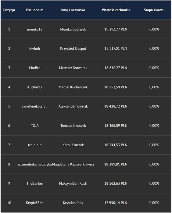 Na pierwszym miejscu do finału przystępuje reprezentantka płci pięknej – Monika Ceglarek, która w I etapie gry kryła się pod nickiem „monika12”. Jej wynik na starcie ostatecznej rozgrywki to 19 293,77 zł dzięki imponującej stopie zwrotu 28,6 proc. w I etapie.