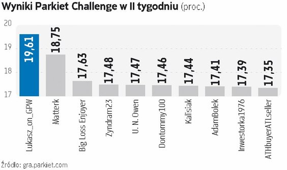 W czołówce gry nastąpiły spore przeszacowania. Obecnie liderem (po dwóch tygodniach) pierwszego etapu jest „AdamBolek” z 19-proc. stopą zwrotu. Drugi jest „Matrixss22”, który jak dotąd zarobił ponad 18 proc., a trzeci – „Czachon77”.