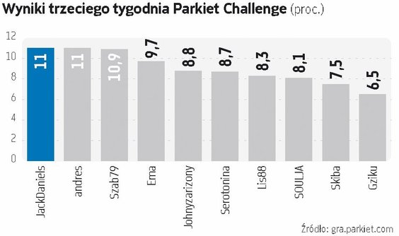 W klasyfikacji po trzech tygodniach Parkiet Challenge wygrywa "AdamBolek", którego stopa zwrotu w tym okresie to ponad 23 proc., co oznacza wzrost początkowego kapitału do 24,6 tys. zł i to on wchodzi do finału z pierwszego miejsca. Kolejny jest "Matrixss22" z 21,4-proc. zyskiem, zaś trzeci – "Szab79", który w trzy tygodnie osiągnął 21,4-proc. – różnica między graczami była minimalna. Ponad 20-proc. stopy zwrotu w ciągu trzech tygodni osiągnęło sześciu graczy, natomiast rynek był bardzo kapryśny. Pierwszy tydzień Parkiet Challenge przypadł na spadki akcji, w następnym zaś mieliśmy wyraźne odreagowanie.
