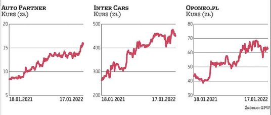 Ubiegłoroczne dokonania dystrybutorów części samochodowych zostały docenione przez inwestorów. Ich notowania od blisko dwóch lat pozostają w trendzie wzrostowym, ustanawiając po drodze rekordy. Tylko w ciągu ostatnich 12 miesięcy akcje Inter Carsu zyskały ponad 70 proc., ponad 90 proc. można było zarobić na papierach Auto Partnera, a prawie 50 proc. – oponeo.pl.