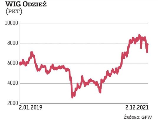 O prawie 50 proc. urosła w tym roku wartość indeksu grupującego firmy odzieżowe i obuwnicze. To więcej niż w ciągu dwóch lat. To oznacza, że indeks z nawiązką nadrobił straty z kryzysu wywołanego koronawirusem. Nie jest to jednak cała prawda o branży, bo indeks zależy głównie od dwóch gigantów: LPP i CCC, a jego wzrost w ostatnich dwóch latach i w tym roku to zasługa przede wszystkim pierwszego z nich. Przez 24 miesiące akcje LPP podrożały o około 58 proc. (uwzględniając ostatnie spadki), a w tym roku o 63 proc. Nie był to jednak lider wzrostów. Walory Esotiq & Henderson podrożały w tym roku o 291 proc., a w dwa lata prawie o 520 proc. ziu