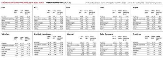 Do spółek wyraźnie odbudowujących pozycję rynkową po 2020 r. należą firmy największe, czyli LPP i CCC. Na wyniki właściciela Reserved za III kwartał jeszcze czekamy. Porównanie danych półrocza 2021 r. z rezultatami z trzech kwartałów 2019 r. sugeruje jednak, że z przekroczeniem ówczesnych wyników kłopotu być nie powinno. Do pobicia przychodów brakuje raptem miliarda złotych.