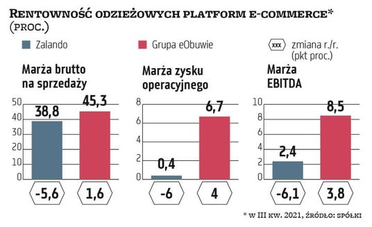 Grupa eObuwie na tle Zalando wypadła dobrze. W kwartale kończącym się 31 października odnotowała 822 mln zł przychodu, o 44 proc. więcej niż przed rokiem, i poprawiła zyskowność. Jej marża brutto na sprzedaży urosła o 1,6 pkt proc., do 45,3 proc., a marża EBITDA o 3,8 pkt proc., do 8,5 proc. Taki poziom marży EBITDA internetowej spółki zakładała ogłoszona na początku 2020 r. strategia Grupy CCC (Go.22). Strategia ta w tym miesiącu ma zostać zaktualizowana, w tym właśnie o cele dla rozwijającego się szybko e-commerce grupy.