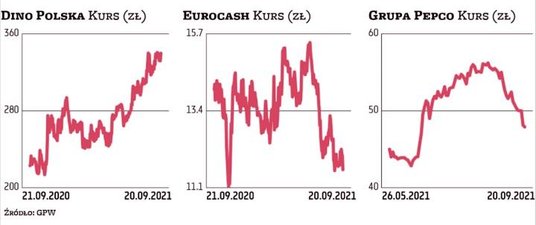 Akcje handlowej spółki zwyżkowały pod koniec dnia o ponad 4 proc., ustanawiając nowe historyczne szczyty. W drugim kierunku podążał Eurocash. Akcje detaliczno-hurtowej grupy przebijały chwilami poziom 11,5 zł, ustanawiając nowe w tym roku minima. Przypomnijmy, że dołek w październiku wypadł przy około 11 zł. W słabszej formie od połowy sierpnia pozostaje także Grupa Pepco, tegoroczny debiutant na GPW.