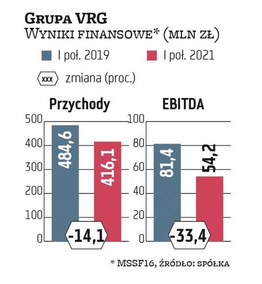 Natomiast są nadal sporo słabsze niż w 2019 r. Przychody krakowskiej grupy w zakończonym 30 czerwca okresie wyniosły nieco ponad 416 mln zł i były o około 14 proc. niższe niż w ostatnim roku przed pandemią. Zysk operacyjny powiększony o amortyzację (EBITDA) okazał się zaś słabszy niż w I połowie 2019 r. o około 33 proc. Jeszcze większy dystans dzieli wykazany po sześciu miesiącach br. i 2019 r. wynik netto. Półroczny czysty zarobek grupy VRG wyniósł 2,8 mln zł, podczas gdy w 2019 r. blisko 22 mln zł.